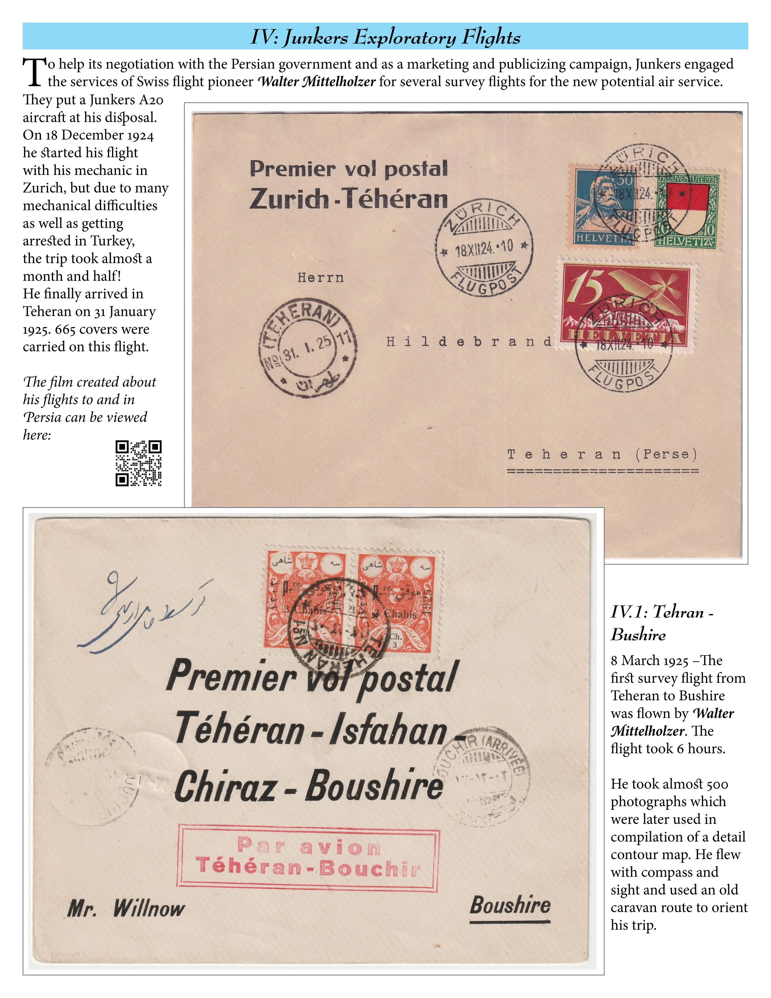 The purpose of this one-frame airmail exhibit is to present the development of airmail service in Persia during the pioneer period. The pioneer aerial service period in Persia is defined as the time up to the establishment of regular domestic airmail service and the issuance of the first airmail stamps in 1927.