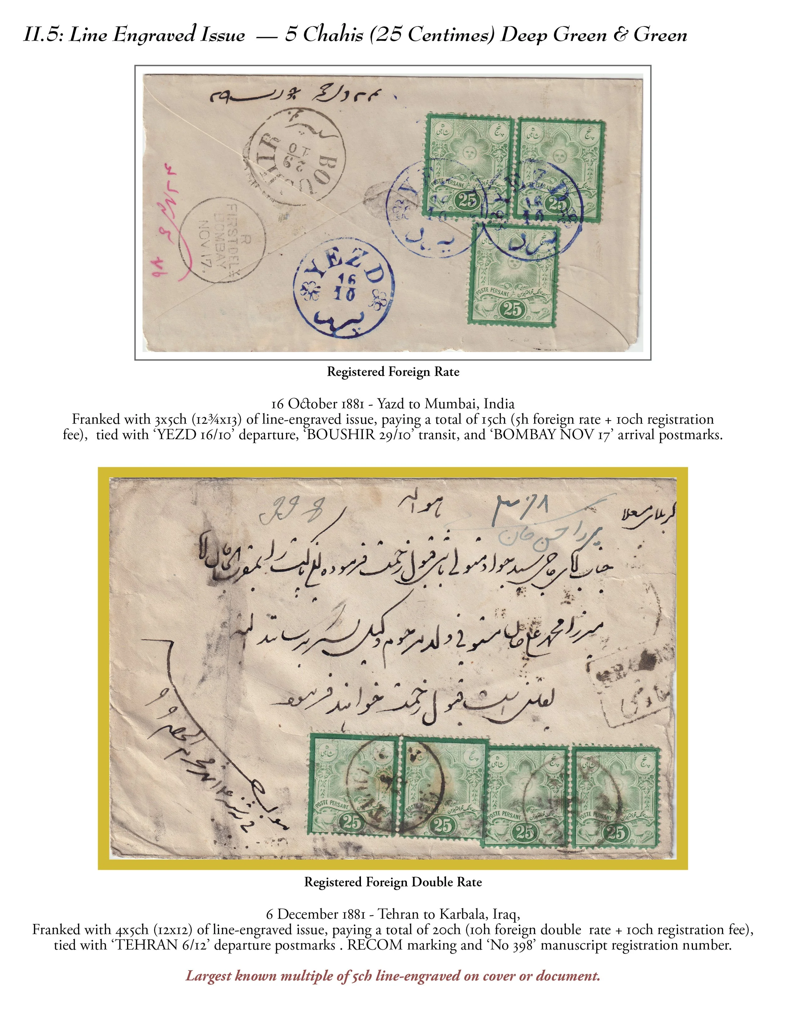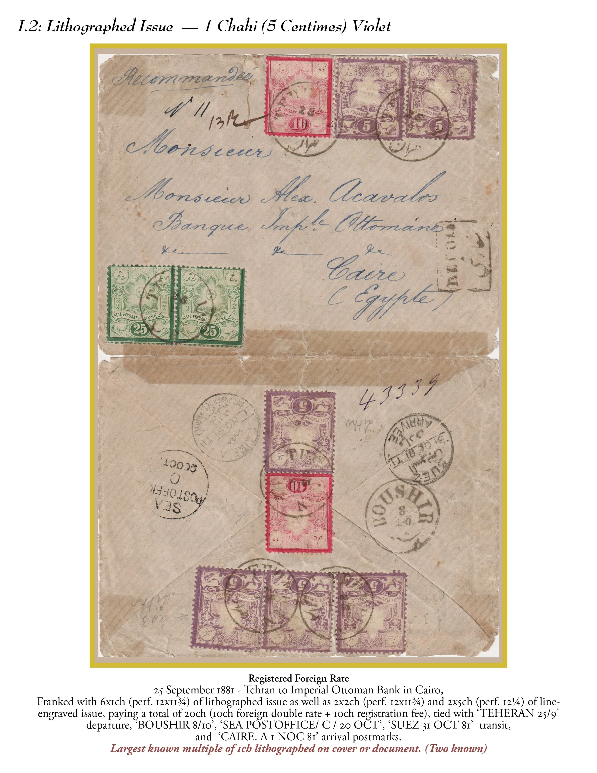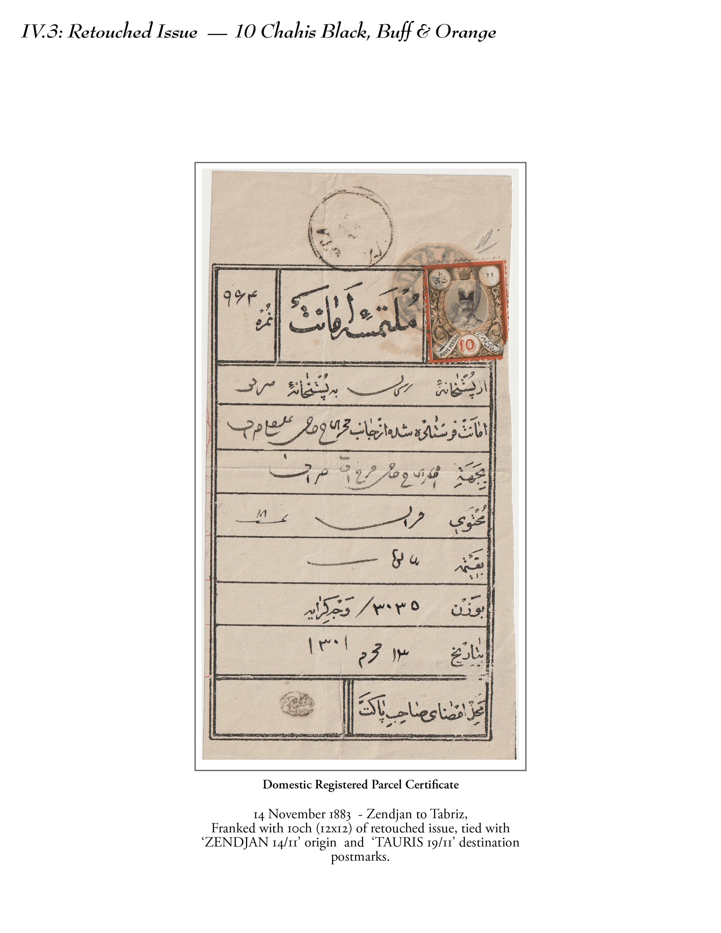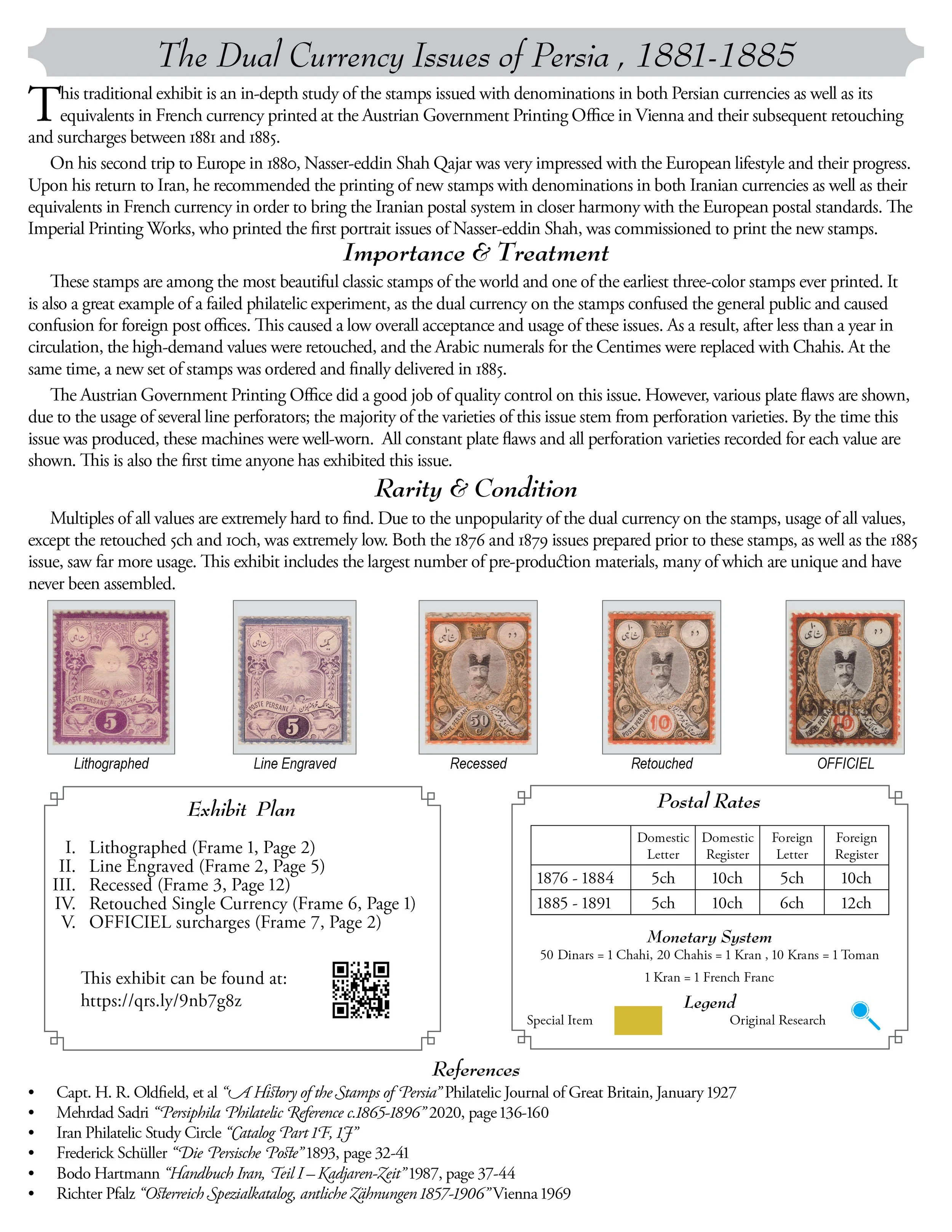 This exhibit explores the stamps issued with denominations in both Persian currency and its equivalents in French currency and their subsequent retouching and surcharges.